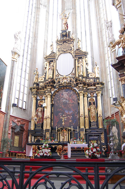 Eso sí, nada más entrar te encuentras cartelones prohibiendo terminantemente el hacer fotografías o grabar en vídeo. Yo, aprovechando que el párroco no miraba, y con la camara sutilmente colgando de mi cuello, logré sacar alguna instanténea sin usar el flash, porque el interior es uno de los más hermosos que he visto en la vida para una iglesia que no es enorme precisamente. Pero la rica decoración combinando negros, mármoles y dorados es impresionante.